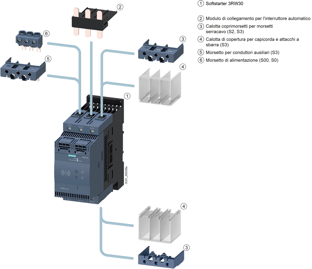 softstarter SIRIUS S2 45 A, 22 kW/400 V, 40 °C AC 200-480 V, AC/DC 24 V morsetti a molla Softstarter SIRIUS 3RW30 per applicazioni standard con avviamento graduale di motori asincroni trifase. Avviamento graduale, riduzione dei picchi di corrente, esclusione di oscillazioni della tensione di rete durante lavviamento, sgravio del carico della rete di alimentazione, del carico meccanico nellazionamento, notevole risparmio di spazio e cablaggio rispetto agli avviatori stella-triangolo e ai convertitori di frequenza, assenza di manutenzione e grande facilità duso. Il bypass integrato consente di realizzare una forma costruttiva assai compatta e assicura un basso riscaldamento nel quadro elettrico. Omologazioni internazionali (ad es. IEC e UL/CSA). I softstarter 3RW sono disponibili per reti fino a 690 V in un ampio campo di potenza con diverse tensioni di alimentazione di comando e con morsetti a vite e molla. Per 3RW30/40 ci sono ulteriori varianti con tensione di alimentazione di comando di 24 V. Alcuni dei 3RW40 fino alla grandezza costruttiva S3 nonché tutti i 3RW44 offrono inoltre una protezione motore a termistori. Con il modulo di collegamento opzionale si possono montare i softstarter sugli interruttori automatici, persino per le varianti con contatti a molla. Semplice, efficiente, sempre attuale - il sistema modulare SIRIUS.