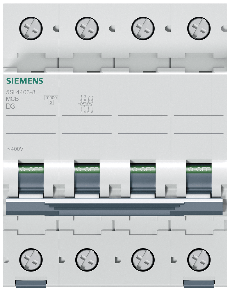 Interruttore magnetotermico 400V 10 kA, a 4 poli, D, 3A Interruttore magnetotermico SENTRON per la protezione da cortocircuito e sovraccarico sicura per applicazioni standard in edifici residenziali e funzionali. Montaggio e smontaggio dellapparecchio senza attrezzi. Semplice cablaggio dellalimentazione mediante la sbarra collettrice posteriore. Gli interruttori magnetotermici 5SL sono disponibili in esecuzione a 1, 2, 3, 4 poli nonché a 1 polo +N e a 3 poli +N nonché in ulteriori tipi speciali. I numerosi accessori, come ad es. i blocchetti di contatti ausiliari, consentono una varietà di ampliamenti funzionali. Semplicemente sicuri con gli apparecchi di protezione di SENTRON.