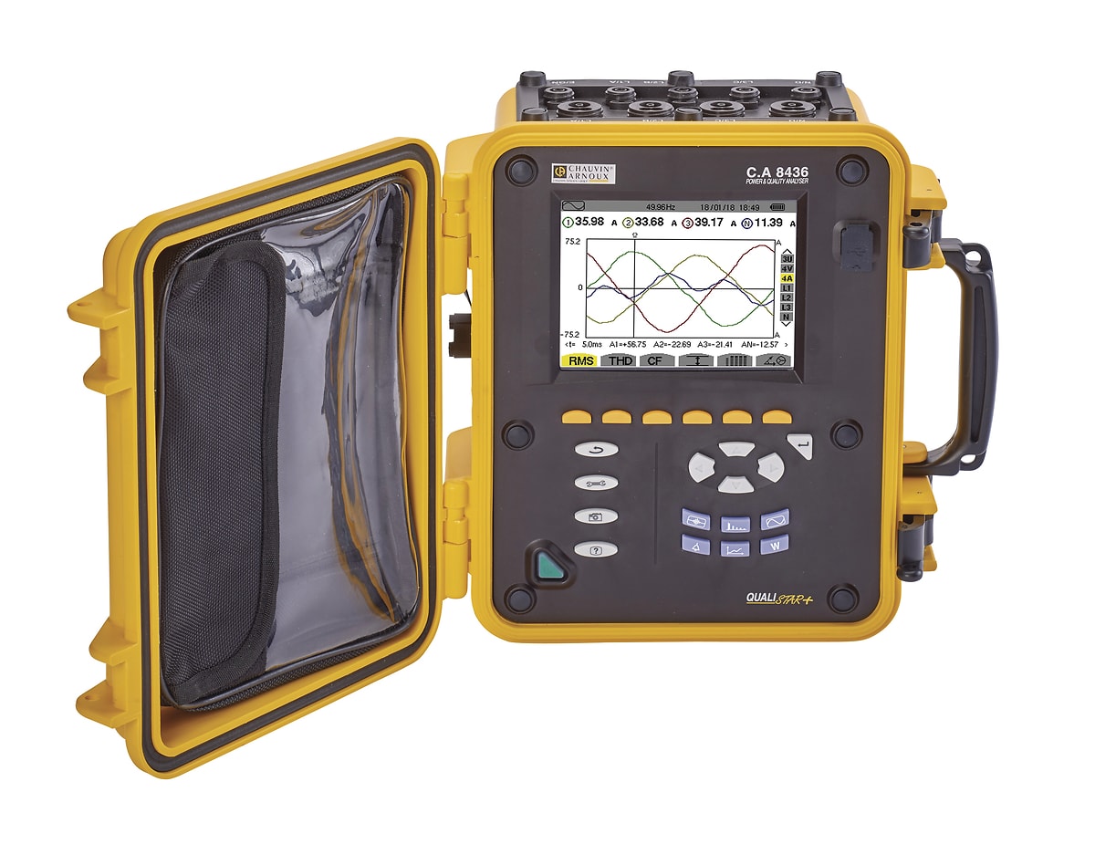 Dotato di un display TFT grafico a colori (320 x 240) il Qualistar+ C.A 8436 permette di ottenere in modo semplice e rapido la situazione delle principali caratteristiche della rete elettricaManeggevole e compatto il CA 8436 visualizza in tempo reale le forme d'onda dei 5 ingressi in tensione e 4 ingressi in corrente.I sensori di corrente non appena connessi allo strumento vengono automaticamente riconosciuti (sistema Plug & Play): é così possibile collegare diversi tipi di sensori contemporaneamete ed impostare la configurazione dei rapportiottenendo una lettura diretta delle misure.La facilità d'uso dei Qualistar+ si adatta alle applicazioni in campo:Le molteplici funzionalità rendono il Qualistar+ C.A 8436 polivalente e adatto alle applicazioni in sicurezza fino a 1.000V Cat.III, e 600V Cat.IVLe misure vengono realizzate con l'ausilio di due software: PAT e Dataview® in opzione