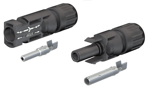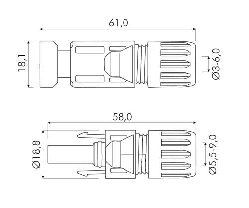 ** Caratteristiche Generali ** Serie produttore: Solarline Tipo Connettore: MC4 Colore: Nero Genere Corpo: Maschio+Femmina Genere Contatto: Maschio+Femmina Serie Fornitore: PV-KST4/6II-UR - PV-KBT4/6II-UR ** Caratteristiche Elettriche ** Corrente max: 30A Tensione max: 1000V Tensione Isolamento: 6 KV ** Caratteristiche Meccaniche ** Tipo contatto: a crimpare Terminazione: a crimpare Montaggio connettore: volante Sezione conduttori: 4-6mm² Diametro cavo min: 4.7mm Diametro cavo max: 6.4mm Grado di protezione: IP65 ** Caratteristiche Termiche ** Classe di infiammabilità: UL94V-0