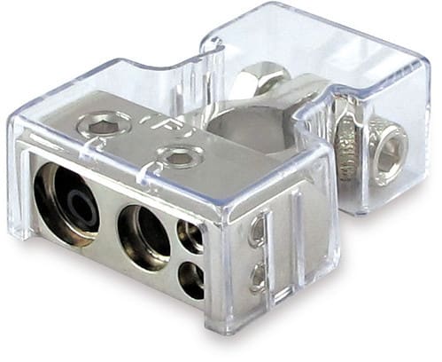Morsetto per batterie da trazione con quattro uscite per sezioni di cavo differenti. 1. diametro max 12mm 1. diametro max 9mm 2. diametro max 5mm ** Caratteristiche Generali ** Genere: Terminatore ** Caratteristiche Meccaniche ** Polarità: Negativo
