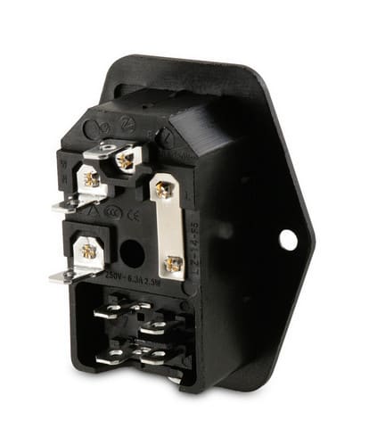 Portafusibile 5x20 max 10A 250V** Caratteristiche Generali **Genere: SpinaFoglio tecnico: C14Colore: NeroOrientamento: Dritto** Caratteristiche Elettriche **Corrente max: 10ATensione max: 250V** Caratteristiche Meccaniche **Materiale Corpo: Termoplastico rinforzato con fibra di vetroMateriale Contatto: Lega di rameTipo contatto: faston 4.8mmMontaggio connettore: pannelloForo fissaggio: 28.2mm x 48mm** Caratteristiche Termiche **Temperatura di lavoro: 0/70°C