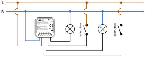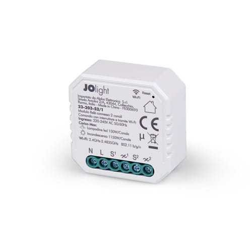 Lo switch 23-203-S2/1 ti permette di rendere il tuo interruttore intelligente. Semplicemente collegando il dispositivo all'interruttore esistente potrai accendere e spegnere il carico tramite l'interruttore stesso e anche tramite l'app Smart Life Tuya (disponibile per Android e iOS).** Dati Tecnici **Tensione d’ingresso: 220-240V AC 50/60HzUscita: 2 canaliTipo uscita: morsettiCarico applicabile:2*1150W Incandescenza150W LEDTemp. di Funzionamento: -10°C a 40°CDimensioni LxWxH: 46x46x18mmGrado di protezione: IP20** Caratteristiche Generali **Funzione: SwitchMetodo di controllo: App Wi-Fi, PulsantePiattaforme compatibili: Smart Life, TuyaFrequenza di trasmissione Wi-Fi: 2.4GHzConfigurazione iniziale: Da programmareInstallazione: Tramite appDimensioni compatte adatte per scatole 503Non necessita di hub o gateway dedicato.Integrabile con il controllo vocale di Amazon Alexa o Google Assistant.Compatibile solo con reti Wi-Fi 2,4GHz.Procedura di Reset/Accoppiamento:- Partendo con il dispositivo accesso(quello collegato al modulo interruttore) eseguire 5 cicli (Off/On), oppure premere il tasto reset per almeno 10 secondi.Segnale di avvenuto Reset/Accoppiamento:-Segnale acustico (bip a intermittenza)