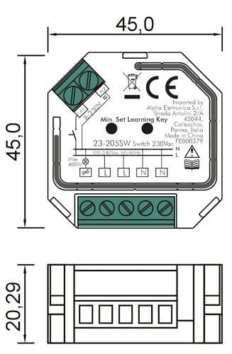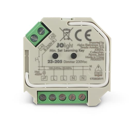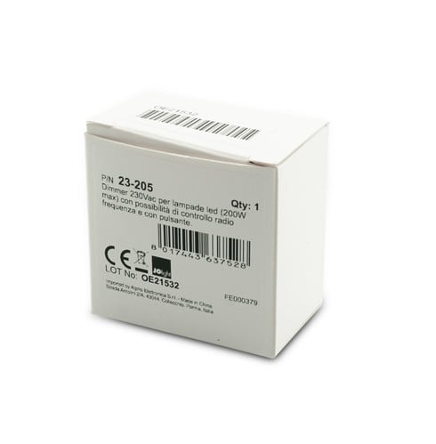 Dimmer controller a taglio di fase (230Vac) con regolazione a pulsante e ricevitore RF.Ricevitore RF multifunzione a 1 canale per lampade 230V.Questo controller funziona da ricevitore per opportuni telecomandi a radio frequenza attraverso i quali è possibile comandare l'intensità di colore.Il telecomando deve essere ordinato separatamente in base alle esigenze di controllo.Il dispositivo 23-205 mantiene memoria dell'ultimo modo di funzionamento impostato anche dopo aver spento e riacceso l'alimentazione.** Dati Tecnici **Tensione d’ingresso: 230VacUscita: 1 canaliTipo uscita: morsettiCorrente: 1,5APotenza max:Incandescenza: 400W maxLed dimmerabili: 200W maxNumero massimo dispositivi in parallelo: 10Metodo di controllo: ricevitore per telecomando RFFrequenza: 868MHzTemp. di Funzionamento: -0°C a 40°CDimensioni LxWxH: 45x45.5x20.29mmGrado di protezione: IP20** Caratteristiche Generali **Metodo di controllo: RF, Pulsante** Note **Un ricevitore 23-205 può lavorare con più telecomandi (fino a 8) dello stesso tipo.Un telecomando può lavorare con tanti ricevitori (fino a 100 per ogni zona a patto che tutti i dispositivi coinvolti siamo all’interno del raggio di 20m).Nel caso di installazioni con più di un ricevitore all'interno di una singola zona, occorre impostare il primo ricevitore come MASTER e i successivi come SLAVE.Al momento dell'installazione i telecomandi devono essere associati a tutti i relativi ricevitori tramite il tasto “Learning key” presente sul ricevitore.