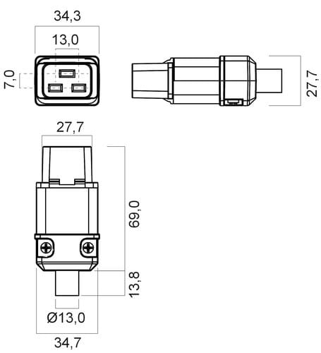 ** Caratteristiche Generali **Genere: PresaFoglio tecnico: C19Colore: NeroOrientamento: Dritto** Caratteristiche Elettriche **Corrente max: 16ATensione max: 250V** Caratteristiche Meccaniche **Materiale Corpo: ABSMateriale Contatto: NickelMontaggio connettore: volante** Caratteristiche Termiche **Temperatura di lavoro: -40/70°C