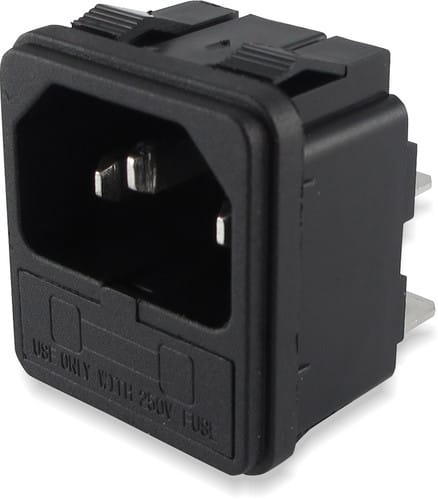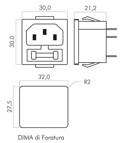** Caratteristiche Generali ** Genere: Spina Norma di riferimento: EN 60320 Foglio tecnico: C14 ** Caratteristiche Elettriche ** Corrente max: 10A Tensione max: 250V ** Caratteristiche Meccaniche ** Formato Fusibile: 5x20mm Materiale Corpo: Termoplastico rinforzato con fibra di vetro Materiale Contatto: Lega di rame Tipo contatto: faston 6.3mm Montaggio connettore: pannello ** Caratteristiche Termiche ** Temperatura di lavoro: 0/70°C
