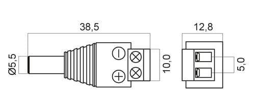 ** Caratteristiche Generali **Genere: SpinaOrientamento: DrittoTipo Connettore A: 5,5-2,5Genere A: SpinaTipo Connettore A: Spina 5,5-2,5Tipo Connettore B: Morsetto a viteTipo Connettore B: Morsetto a vite 2 poli** Caratteristiche Meccaniche **Materiale Corpo: PVCMateriale Contatto: Ottone nichelato