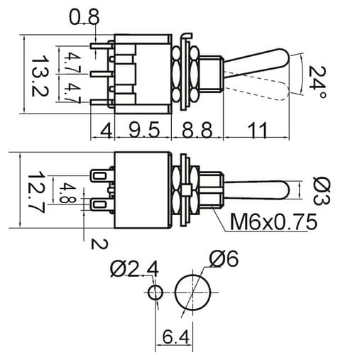 ** Caratteristiche Generali **Attuatore: LevettaSerie: MiniaturaSerigrafia: NessunaLuminoso: noMateriale attuatore: Ottone nichelatoTipi contatti: DPDTPortata: 3A@250Vac, 6A@125VacN. poli: 2Stato dei contatti: ON/ONTipo terminale: a saldareN. terminali: 6Montaggio: Pannello con dadoForo fissaggio: ø6mm