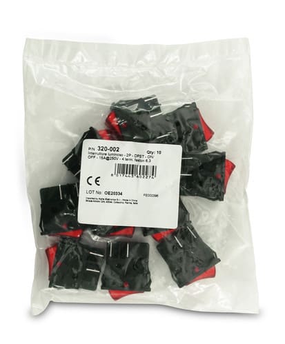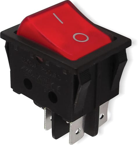 ** Caratteristiche Generali **Attuatore: BilanciereSerigrafia: I/OLuminoso: siColore illuminazione: RossoColore: RossoMateriale attuatore: PlasticaTipi contatti: DPSTPortata: 15A@250Vac, 20A@125VacN. poli: 2Stato dei contatti: ON/OFFTipo terminale: faston 6,3N. terminali: 4Montaggio: Pannello a incastroForo fissaggio: 22mm x 30.2mm