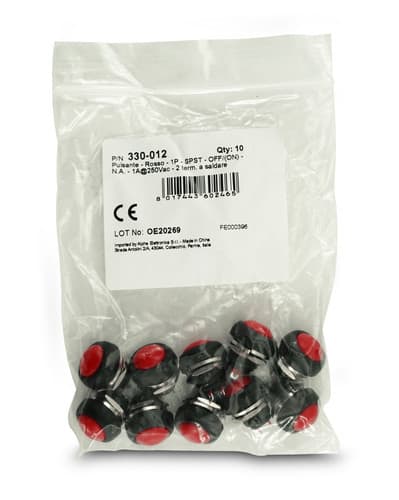 ** Caratteristiche Generali **Attuatore: PulsanteSerigrafia: NessunaLuminoso: noColore: RossoMateriale attuatore: PlasticaTipi contatti: SPSTPortata: 1A@250Vac, 3A@125VacN. poli: 1Stato dei contatti: OFF/(ON) - N.A.Tipo terminale: a saldareN. terminali: 2Montaggio: Pannello con dadoForo fissaggio: ø12mm