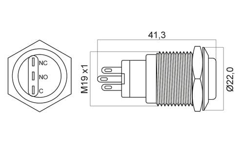 ** Caratteristiche Generali **Attuatore: Pulsante antivandaloSerie: AntivandaloForma dell'attuatore: In rilievoLuminoso: noColore: LucidoMateriale attuatore: AcciaioTipi contatti: SPDTPortata: 5A@250Vac, 5A@36VdcN. poli: 1Stato dei contatti: ON/ONTipo terminale: a saldareN. terminali: 3Montaggio: a pannelloForo fissaggio: ø19mmGrado di protezione: ip65Temperatura di lavoro: -10 / 40°C