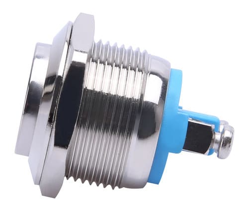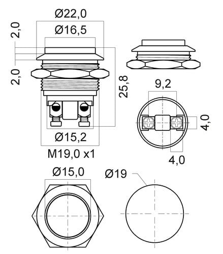 ** Caratteristiche Generali **Attuatore: Pulsante antivandaloSerie: AntivandaloForma dell'attuatore: In rilievoSerigrafia: NessunaLuminoso: noColore: MetalloMateriale attuatore: AcciaioTipi contatti: SPSTPortata: 3A@250VacN. poli: 1Stato dei contatti: OFF/(ON) - N.A.Tipo terminale: viteN. terminali: 2Montaggio: Pannello con dadoForo fissaggio: ø19mmGrado di protezione: IP65Temperatura di lavoro: -30 / 70°C