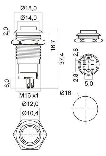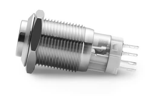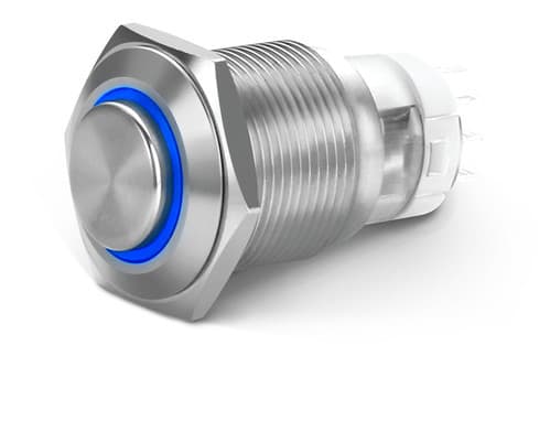 ** Caratteristiche Generali **Attuatore: Pulsante antivandaloSerie: AntivandaloForma dell'attuatore: In rilievoSerigrafia: NessunaLuminoso: siColore illuminazione: BluTensione illuminazione: 24Vac/dcColore: MetalloMateriale attuatore: AcciaioTipi contatti: SPDTPortata: 3A@250VacN. poli: 1Stato dei contatti: ON/ONTipo terminale: a saldareN. terminali: 5Montaggio: Pannello con dadoForo fissaggio: ø16mmGrado di protezione: IP65Temperatura di lavoro: -20 / 55°C