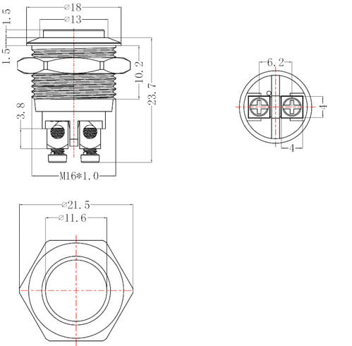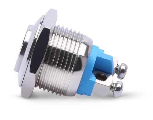 ** Caratteristiche Generali **Attuatore: Pulsante antivandaloSerie: AntivandaloForma dell'attuatore: In rilievoSerigrafia: NessunaLuminoso: noColore: MetalloMateriale attuatore: AcciaioTipi contatti: SPSTPortata: 2A@250Vac, 3A@125VacN. poli: 1Stato dei contatti: OFF/(ON) - N.A.Tipo terminale: viteN. terminali: 2Montaggio: Pannello con dadoForo fissaggio: ø16mmGrado di protezione: IP65Temperatura di lavoro: -20 / 55°C
