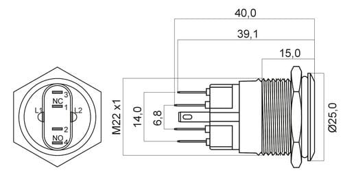 ** Caratteristiche Generali ** Attuatore: Pulsante antivandalo Serie: Antivandalo Forma dell'attuatore: Piatto Luminoso: si Colore illuminazione: Blu Tensione illuminazione: 24Vac/dc Colore: Metallo Materiale attuatore: Acciaio Tipi contatti: SPST Portata: 5A@250Vac, 5A@36Vdc N. poli: 2 Stato dei contatti: N.C. + N.A. Tipo terminale: a saldare N. terminali: 6 Montaggio: a pannello Foro fissaggio: ø22mm Grado di protezione: IP65 Temperatura di lavoro: -20 / 55°C