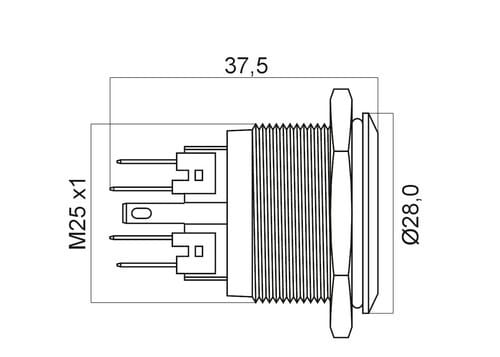 ** Caratteristiche Generali ** Attuatore: Pulsante antivandalo Serie: Antivandalo Forma dell'attuatore: In rilievo Luminoso: si Colore illuminazione: Rosso Tensione illuminazione: 24Vac/dc Colore: Lucido Materiale attuatore: Acciaio Tipi contatti: SPST Portata: 5A@250Vac, 5A@36Vdc N. poli: 4 Stato dei contatti: 2 x N.C. + 2 x N.A. Tipo terminale: a saldare N. terminali: 10 Montaggio: Pannello con dado Foro fissaggio: ø25mm Grado di protezione: IP65 Temperatura di lavoro: -10 / 40°C