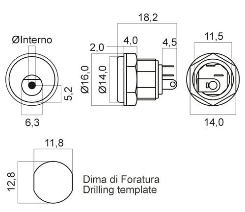 ** Caratteristiche Generali **Genere: PresaQualità: HQ** Caratteristiche Meccaniche **Materiale Corpo: BacheliteMateriale Contatto: Ottone nichelatoTipo contatto: a saldareMontaggio connettore: pannelloDiametro Esterno: 5.5mmDiametro Interno: 2.1mm