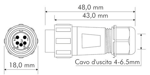 ** Caratteristiche Generali **Genere: SpinaOrientamento: DrittoNr. Poli: 5Serie Fornitore: SP13** Caratteristiche Elettriche **Corrente max: 5ATensione max: 250V** Caratteristiche Meccaniche **Materiale Corpo: NylonMateriale Contatto: Lega dirame dorataTipo contatto: a saldareTerminazione: a saldareMontaggio connettore: volanteSezione conduttori: 0-0.79mm²Diametro cavo min: 4mmDiametro cavo max: 6.5mmGrado di protezione: IP68** Caratteristiche Termiche **Temperatura di lavoro: -25/80°C