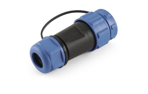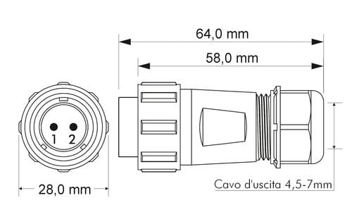 ** Caratteristiche Generali **Genere: SpinaOrientamento: DrittoNr. Poli: 2Serie Fornitore: SP21** Caratteristiche Elettriche **Corrente max: 30ATensione max: 500V** Caratteristiche Meccaniche **Materiale Corpo: NylonMateriale Contatto: Lega di rame dorataTipo contatto: a saldareTerminazione: a saldareMontaggio connettore: volanteSezione conduttori: 0-4mm²Diametro cavo min: 4.5mmDiametro cavo max: 7mmGrado di protezione: IP68** Caratteristiche Termiche **Temperatura di lavoro: -25/80°C