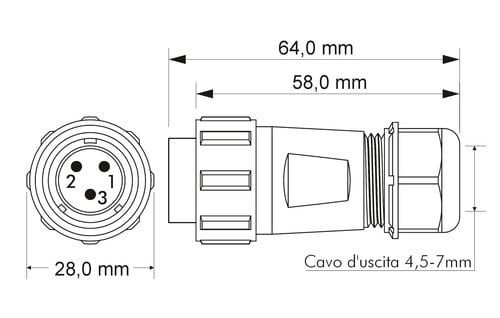 ** Caratteristiche Generali **Genere: SpinaOrientamento: DrittoNr. Poli: 3Serie Fornitore: SP21** Caratteristiche Elettriche **Corrente max: 30ATensione max: 500V** Caratteristiche Meccaniche **Materiale Corpo: NylonMateriale Contatto: Lega di rame dorataTipo contatto: a saldareMontaggio connettore: volanteSezione conduttori: 0-4mm²Diametro cavo min: 4.5mmDiametro cavo max: 7mmGrado di protezione: IP68** Caratteristiche Termiche **Temperatura di lavoro: -25/80°C