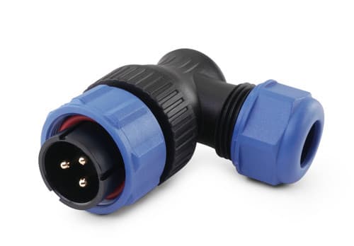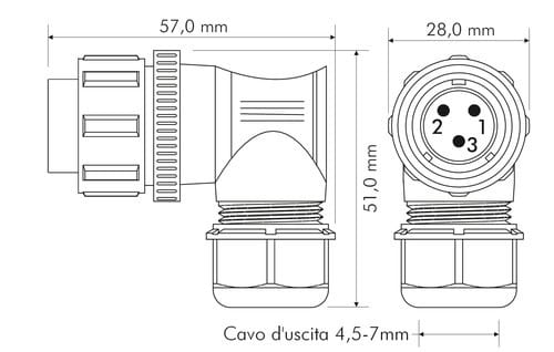 ** Caratteristiche Generali **Genere: SpinaOrientamento: 90°Nr. Poli: 3Serie Fornitore: SP21** Caratteristiche Elettriche **Corrente max: 30ATensione max: 500V** Caratteristiche Meccaniche **Materiale Corpo: NylonMateriale Contatto: Lega di rame dorataTipo contatto: a saldareMontaggio connettore: volanteSezione conduttori: 0-4mm²Diametro cavo min: 4.5mmDiametro cavo max: 7mmGrado di protezione: IP68** Caratteristiche Termiche **Temperatura di lavoro: -25/80°C