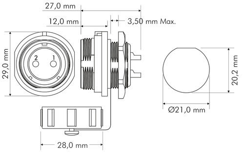 ** Caratteristiche Generali **Genere: PresaOrientamento: DrittoNr. Poli: 2Serie Fornitore: SP21** Caratteristiche Elettriche **Corrente max: 30ATensione max: 500V** Caratteristiche Meccaniche **Materiale Corpo: NylonMateriale Contatto: Lega di rame dorataTipo contatto: a saldareMontaggio connettore: pannelloSezione conduttori: 0-4mm²Grado di protezione: IP68** Caratteristiche Termiche **Temperatura di lavoro: -25/80°C