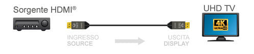 ** Caratteristiche **Interfaccia: HDMI®Tipologia: HDMI® High Speed with EthernetRisoluzione massima: 2160p (4K@60fps)Standard supportati: ARC, CEC, HDRProfondità colore: 16 bit/canaleCompatibile 3D: siVersione HDCP: 2.2Velocità: 18GbpsColore cavo: GrigioLunghezza Cavo: 10mDiametro cavo: ø5mmTipo Cavo: Fibra otticaApplicazione CPR: Posa mobileTecnologia: AttivoGuaina cavo: PVCCorpo connettori: MetallicoFinitura contatto : DoratoRaggio di curvatura min: 10mm** Connettore A **Tipo Connettore A: Spina HDMI® 19 poli Dritto** Connettore B **Tipo Connettore B: Spina HDMI® 19 poli DrittoAttenzione: verso di collegamento indicato sul connettore.