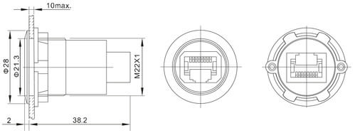 Fissaggio a pannelloSpessore pannello: 1-8mmDiametro foro: ø22mm** Caratteristiche Generali **Genere: PresaColore: NeroOrientamento: DrittoTipo Connettore A: RJ45Genere A: PresaTipo Connettore A: Presa RJ45Tipo Connettore B: RJ45Genere B: PresaTipo Connettore B: Presa RJ45** Caratteristiche Meccaniche **Materiale Corpo: MetalloLa presa viene definita IP65 esclusivamente installando la cover opzionale "P-CAPN". In caso di mancata installazione di tale cover il grado di protezione è IP20.