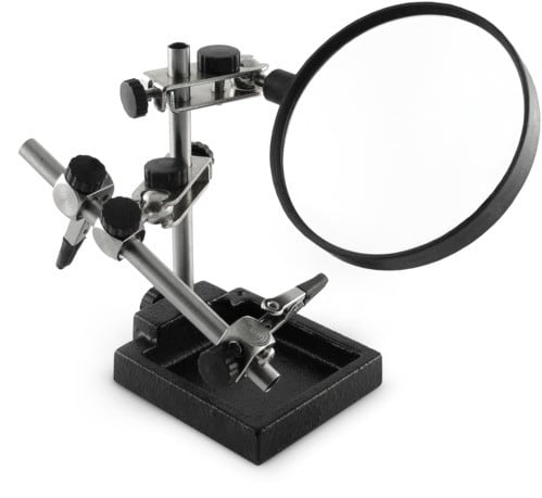 Con pinze coccodrillo, base in acciaio e lente. Grazie all’ampia snodabilità, permette di avere le mani libere ed una comoda posizione di lavoro. Adatto per laboratori ed hobbisti