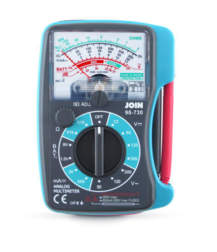Multimetro portatile analogico compatto e robusto che unisce la tecnica di misurazione analogica tradizionale a un equipaggiamento moderno. Gli ingressi sono protetti contro i sovraccarichi. Il multimetro ha sei gamme di misurazione: Tensione (CC), Corrente (CC), Tensione (CA), Corrente (CA), Resistenza, Decibel, Prova batteria (1,5V e 9V).** Caratteristiche Generali **Tipo di misuratore: Multimetro analogicoGrandezze misurabili: Tensione AC, Tensione DC, Resistenza, Corrente DC, Prova batterieIndicazione: Scala graduataProtezioni: SovraccaricoData Hold: NoMemoria: NoInterfaccia PC: NoSoftware/firmware aggiornabile: NoFunzione autodiagnosi: NoSpegnimento automatico: NoAdatto per: Batterie, ResistenzeConnessioni: PuntaliFunzioni aggiuntive:TascabileAccessori inclusi: Puntali** Caratteristiche Elettriche **Livello sicurezza: Cat IIITipo batterie: 1xAAABatterie incluse: No** Caratteristiche Meccaniche **Grado di protezione: IP20Dimensioni: 28mm x 85mm x 119mmTemperatura di lavoro:0 / 40°CTemperatura di stoccaggio: 0 / 50°CUmidità atmosferica relativa: