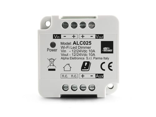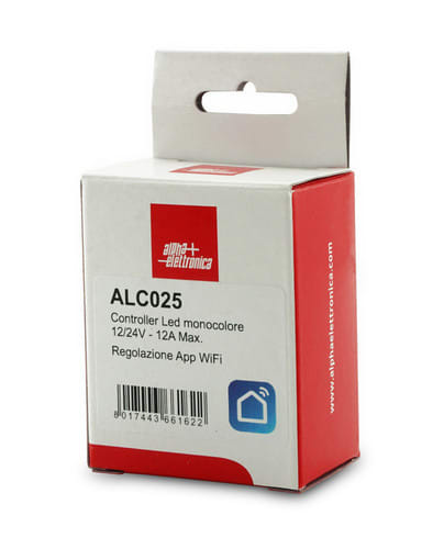 ** Caratteristiche generali **Dimmer monocolore per strisce led e sorgenti led resistive a tensione costante 12V oppure 24V. Il controllo dell’intensità luminosa viene eseguito tramite applicazione SmartLife, disponibile per Android e iOS.** Tipologiacontrollo **Comando: tramite App** Funzionamento **- On/Off da remoto tramite App- Variazione dell'intensità luminosa- Timer di accensione e spegnimento all'orario prestabilito** Protezioni **SovratemperaturaInversione di polaritàSovraccaricoCortocircuito in uscitaSovra-alimentazioneSotto-alimentazione** Caratteristiche Generali **Funzione: ControllerAdatto per: Monocolore** Caratteristiche Elettriche **Tipo regolazione: Tensione costante (CV)Tensione d'ingresso: 12/24VTensione d'uscita: come ingressoTipo di uscita: morsettiMetodo di connessione: anodo comuneCorrente/Ch: 10An. canali: 1Potenza nominale (12V): 120WPotenza nominale (24V): 240W** Caratteristiche Meccaniche **Lunghezza: 48.8mmLarghezza: 48.8mmAltezza: 24mmGrado di protezione: IP20Materiale corpo: PlasticaColore corpo: Bianco** Caratteristiche Termiche **Temp. di funzionamento: -10 / 40°C** Note **L’installazione deve essere eseguita solamente da personale qualificato.Il prodotto deve essere installato all’interno di un quadro elettrico.Installare un fusibile adeguato in ingresso al dispositivo.L’alimentatore dovrà essere scelto in funzione del carico led collegato per tensione e corrente.Utilizzare un alimentatore con potenza nominale maggiore rispetto al carico da alimentare (circa 30%).In caso di black-out il dimmer ALC025 mantiene memoria:- della modalità di funzionamento (statica o scena)- dell'intensità della dimmerazioneNon mantiene memoria dello stato acceso/spento: al ritorno dell'alimentazione il carico è sempre acceso.Eventuali timer, programmazioni rimangono salvate nel cloud.Se un evento temporizzato avviene mentre il dimmer non è alimentato, l'evento può essere perso.