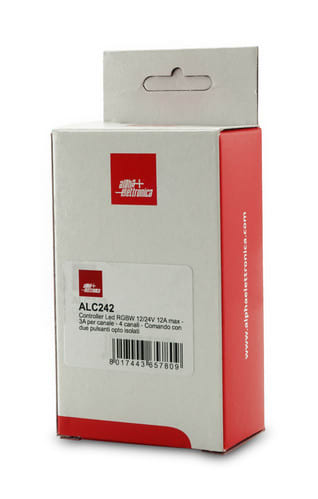 Caratteristiche generaliController RGBW per strisce led e sorgenti led resistive a tensione costante 12V oppure 24V. Il controllo dell'intensità luminosa e delle funzioni viene eseguito tramite pulsanti generici opportunamente installati ai morsetti P1(Bianco) e P2(RGB). Pulsanti non forniti. Il dispositivo mantiene memoria dell'ultimo modo di funzionamento impostato anche dopo aver spento e riacceso l'alimentazione.** Caratteristiche Generali **Funzione: ControllerAdatto per: RGBWMetodo di controllo: Pulsante** Caratteristiche Elettriche **Tipo regolazione: Tensione costante (CV)Tensione d'ingresso: 12/24VTensione d'uscita: come ingressoTipo di uscita: morsettiMetodo di connessione: anodo comuneCorrente/Ch: 3An. canali: 4Potenza nominale (12V): 144WPotenza nominale (24V): 288W** Caratteristiche Meccaniche **Lunghezza: 76mmLarghezza: 52.5mmAltezza: 24.5mmGrado di protezione: IP20Materiale corpo: PlasticaColore corpo: Bianco** Caratteristiche Termiche **Temp. di funzionamento: -10 / 40°CModalità di utilizzoLa striscia led RGB o RGBW collegata all'uscita del controller ALC242 può essere accesa o spenta tramite pressione dei due pulsanti.Il pulsante P1 controlla il canale Bianco del dimmer:- La pressione breveaccende e spegne il canale Bianco- La pressione lunga mentre il carico è acceso fa variare l'intensità luminosa del canale Bianco- La pressione lunga da spento imposta la modalità "Luce di cortesia", la luce viene accesa con intensità al 10%Il pulsante P2 controlla i canali RGB, con due modalità di funzionamento:- Luce colorata con rotazione colori- Luce colorata fissaE' possibile cambiare la modalità tramite doppio click del pulsante P2.La pressione lunga del pulsante ha funzione differente a seconda della modalità o dello stato in cui si trova il controller ALC242:- Se in "Luce colorata con rotazione colori", viene variata la velocità di rotazione- Se in "Luce colorata fissa"viene variata l’intensità della luceAd ogni pressione prolungata del tasto viene invertita la direzione di variazione della velocità o dell’intensità.ProtezioniSovratemperatura, Inversione di polarità, Sovraccarico, Cortocircuito in uscitaNoteL’installazione deve essere eseguita solamente da personale qualificato. Si consiglia di installare un fusibile adeguato in ingresso al dispositivo. L’alimentatore dovrà essere scelto in funzione del carico led collegato per tensione e corrente. Utilizzare un alimentatore con potenza nominale maggiore rispetto al carico da alimentare (circa 30%).