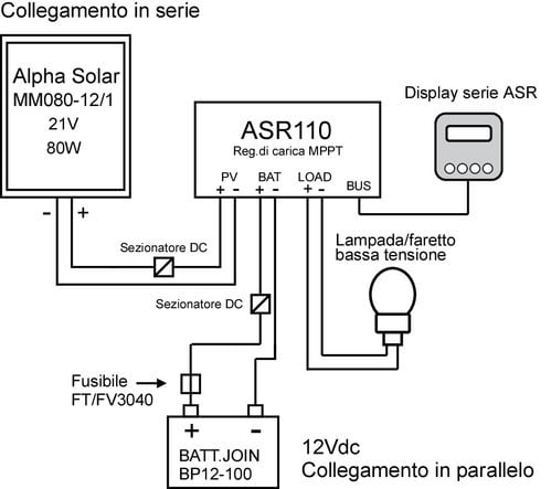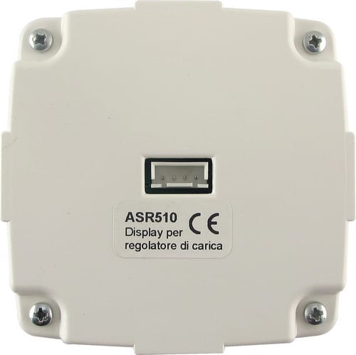 Il display ASR510 Alpha Solar consente di gestire in remoto i regolatori di carica della serie ASR110, ASR120 e ASR130, di monitorare lo stato del sistema fotovoltaico e di controllare l’accensione e lo spegnimento del carico per una distanza massima di 100 metri tramite cavo (cavo incluso da 1mt).** Caratteristiche generali **Visualizzazione dati del sistema fotovoltaicoVisualizzazione energia di carica e scarica del singolo giorno.Tensione di alimentazione: 12-24Vdc (ASR510)Linee display: 8x2Comunicazione: protocollo Modbus RTULunghezza collegamento 100m maxMenù dati visualizzati:- Tensione batteria- Tensione pannello- Corrente di carica dal pannello- Corrente di uscita verso il carico- Temperatura regolatore- Temperatura batteria- Energia di carica del giorno- Energia di scarica del giornoFunzioni controllo remoto:- On-off del carico