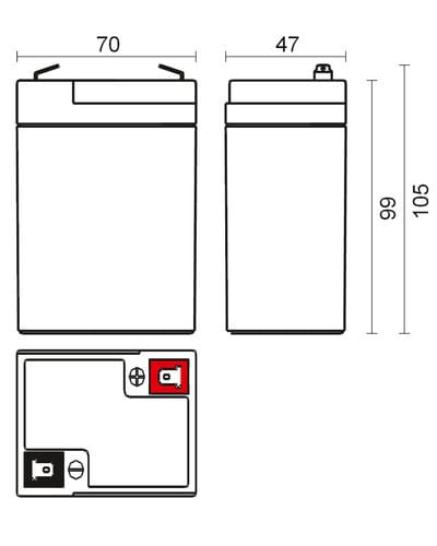 ** Caratteristiche Generali **Adatto per: UPSTecnologia: Piombo AGM** Caratteristiche Elettriche **Tensione: 6VCapacità: 4Ah** Caratteristiche Meccaniche **Dimensioni: 47mm x 70mm x 105mmPeso: 0.67KgConnessioni: faston 4.8mm
