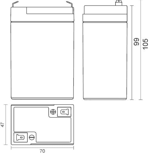 ** Caratteristiche Generali **Adatto per: UPSTecnologia: Piombo AGM** Caratteristiche Elettriche **Tensione: 6VCapacità: 4.5Ah** Caratteristiche Meccaniche **Dimensioni: 47mm x 70mm x 105mmPeso: 0.71KgConnessioni: faston 4.8mm
