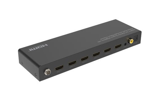 Il commutatore CT204/7 permette il collegamento di 4 diverse sorgenti ad un unico monitor/TV e di selezionare l'ingresso da visualizzare in modo manuale tramite pulsante oppure tramite telecomando incluso. Il collegamento di un dispositivo in ingresso porta alla selezione automatica del canale associato.Lo switch CT204/7, oltre ad avere un'uscita audio analogica/digitale Stereo (3,5mm), Toslink (SPDIF), Coassiale (RCA), è dotato di un'uscita HDMI dedicata esclusivamente al segnale audio (Audio HDMI).** Caratteristiche **Tipologia: SwitchIngresso: 4 HDMI®Uscita: 1 HDMI®Compatibile 3D: siCompatibile 4K: siProfondità colore: 12bit/canaleRisoluzioni supportate: 480i @ 50Hz, 480i @ 60Hz, 480p @ 50Hz, 480p @ 60Hz, 576i @ 50Hz, 576i @ 60Hz, 576p @ 50Hz, 576p @ 60Hz, 720p @ 50Hz, 720p @ 60Hz, 1080i @ 50Hz, 1080i @ 60Hz, 1080p @ 50Hz, 1080p @ 60Hz, 2160p UHD @ 60Hz, 2160p 4K @ 60HzFunzioni aggiuntive: TosLink®, Audio analogico, Audio L/R, HDR, COAX, ARC, CECInterfaccia di controllo: Tasti fisici, TelecomandoSupporto formati audio: Dolby True HD, DTS-HD Master Audio, LPCM 7.1** Caratteristiche Elettriche **Tipo Alimentazione: Alimentatore** Installazione **Montaggio: Desktop** Specifiche HDMI **- Supporto HDR (High Dynamic Range): HDR, HDR10,HDR10+, Dolby Vision, HLG- Conforme HDCP 2.2- 4K@60Hz YUV 4:4:4- Risoluzione supportate: 480i, 480p, 576i, 576p, 720p, 1080i, 1080p, 4Kx2K@30/60Hz- Blu-ray e HD DVD in Full HD (1080p)- Spazio colore RGB, YCbCr, xvYCC- Deep Color- Audio LPCM a 8 canali, 192 kHz, 24bit- Supporto ARC (Audio Return Channel)- Supporta audio fino a 7.1 canali (LPCM, Dolby TrueHD e DTS-HD Master Audio)- Trasmissione dei comandi CEC (CEC Bypass)** Contenuto confezione **1x Commutatore1x Telecomando1x Alimentatore 5V 1A - 5,5x2,1 Positivo centrale