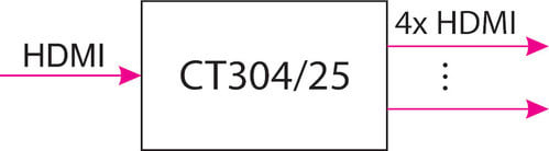 Il distributore di segnale CT304/25 suddivide l’ingresso HDMI in 4 uscite per inviare il segnale sorgente in ingresso ad altrettante uscite. Le uscite sono amplificate ed equalizzate per ottenere le migliori prestazioni.Supporta la tecnologia HDR (High Dynamic Range) che permette, collegato a dispositivi che supportano la stessa tecnologia, di guardare contenuti con una gamma di colori più vicini alla realtà percepita dall'occhio umano.Lo scaler interno consente di gestire in uscita monitor/TV con risoluzioni differenti.Attenzione: solo il formato video HDMI 4K@30/50/60Hz (spazio colore YUV 4:4:4 oppure 4:2:0) può essere scalato a 1080p@30/50/60Hz. Lo scaler non supporta il down scaling di segnali con spazio colore RGB.Nota: è possibile collegare in cascata più distributori (CT304/25) fino a un massimo di 3 livelli.** Caratteristiche **Tipologia: SplitterIngresso: 1 HDMI®Uscita: 4 HDMI®Compatibile 3D: siCompatibile 4K: siProfondità colore: 12bit/canaleRisoluzione massima: 4K @ 60HzRisoluzioni supportate: 480i @ 50Hz, 480i @ 60Hz, 480p @ 50Hz, 480p @ 60Hz, 576i @ 50Hz, 576i @ 60Hz, 576p @ 50Hz, 576p @ 60Hz, 720p @ 50Hz, 720p @ 60Hz, 1080i @ 50Hz, 1080i @ 60Hz, 1080p @ 50Hz, 1080p @ 60Hz, 2160p UHD @ 24Hz, 2160p UHD @ 25Hz, 2160p UHD @ 30Hz, 2160p UHD @ 50Hz, 2160p UHD @ 60Hz, 2160p 4K @ 24Hz, 2160p 4K @ 25Hz, 2160p 4K @ 30Hz, 2160p 4K @ 50Hz, 2160p 4K @ 60HzFunzioni aggiuntive: HDR, Lip sync, CECInstallazione: Plug-and-playSupporto HDCP: HDCP 2.2Supporto formati audio: LPCM 7.1, DTS-HDMaster Audio, Dolby True HD** Caratteristiche Elettriche **Indicatore/i led di stato: Si** Specifiche HDMI **- Conforme HDCP 2.2- Blu-ray e HD DVD in Full HD (1080p)- Spazio colore RGB, YCbCr, xvYCC- Deep Color- Audio LPCM a 8 canali, 192 kHz, 24bit- Supporto DVD Audio- Supporto Super Audio CD- Compatibile Dolby TrueHD- Compatibile DTS HD Master Audio- Auto lip-sync- Trasmissione dei comandi CEC (CEC Bypass)** Contenuto confezione **1x Distributore di segnale1x Alimentatore 5Vdc 1A1xCavo di alimentazione Micro USB