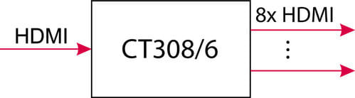 Il distributore di segnale CT308/6 invia il segnale HDMI® in ingresso simultaneamente verso le 8 uscite. Tutte le uscite sono amplificate ed equalizzate per ottenere le migliori prestazioni.** Caratteristiche **Ingresso: 1 HDMI®Uscita: 8 HDMI®Compatibile 3D: siCompatibile 4K: siProfondità colore: 12bit/canaleRisoluzione massima: 4K @ 24Hz, Full HD @ 60HzFunzioni aggiuntive: Lip syncSupporto formati audio: LPCM 7.1, Dolby True HD, DTS-HD Master Audio** Caratteristiche Elettriche **Indicatore/i led di stato: Si** Caratteristiche HDMI supportate **- Conforme HDCP 1.4- Blu-ray e HD DVD in Full HD (1080p)- Spazio colore RGB, YCbCr, xvYCC- Deep Color- Audio LPCM a 8 canali, 192 kHz, 24bit- Supporto DVD Audio- Supporto Super Audio CD- Compatibile Dolby TrueHD- Compatibile DTS HD Master Audio- Auto lip-sync- Trasmissione dei comandi CEC (CEC Bypass)** Risoluzioni supportate **480i@50/60Hz, 576i@50/60Hz, 1080i@50/60Hz480p@50/60Hz, 576p@50/60Hz, 720p@50/60Hz, 1080p@50/60Hz, UHD(3840x2160)@24/25/30Hz, 4K(4096x2160)@24Hz** Contenuto confezione **1x Distributore di segnale1x Alimentatore 5Vdc 2A - 5,5x2,1 Positivo centrale
