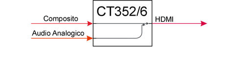 Il convertitore CT352/6 é sviluppato per effettuare la conversione di un segnale video analogico Composito (AV - CVBS) verso un’uscita HDMI.** Specifiche **- Connessioni Video composito, HDMI;- Alimentazione Mini USB;- Non necessita di driver;- Supporta sistemi video PAL e NTSC;- Risoluzioni HDMI in uscita: 720p o 1080p, selezionabile tramite pulsante** Caratteristiche **Tipologia: ConvertitoreIngresso: 1 Composito (CVBS)|Audio L/RUscita: 1 HDMI®Compatibile 3D: noCompatibile 4K: noRisoluzioni supportate: 720p @ 60Hz, 1080p @ 60HzFunzioni aggiuntive: ScalerInstallazione: Plug-and-playInterfaccia di controllo: Tasti fisiciSupporto standard video: NTSC, PAL** Caratteristiche Elettriche **Tipo Alimentazione: Alimentatore** Attenzione **Il convertitore ha una porta per un'alimentazione opzionale. Solo in rari casi, quando le sorgenti non forniscono sufficiente alimentazione attraverso il bus HDMI sarà necessario utilizzare un alimentatore da 5Vdc 1A.** Contenuto confezione **1x Convertitore1x Cavo di alimentazione USB1x Alimentatore 5Vdc 1A