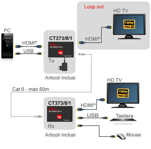 L'extender CT373/8/1 è un dispositivo in grado di estendere la lunghezza dei cavi HDMI utilizzando un singolo cavo Cat.6 e include una unità trasmettitore (Tx) e una unità ricevitore (Rx). E' possibile collegare al trasmettitore(Tx) un PC tramite cavo USB e collegare al ricevitore(Rx) due diverse periferiche (mouse e tastiera per esempio) sempre tramite cavo USB che comunicano direttamente con il PC.** Specifiche **- Coppia di moduli plug-and-play, TX + RX- Estensione su singolo cavo CAT.6 IEEE-568B- Installazione plug and play, nessun driver o software richiesto- Risoluzioni supportate:480i@60Hz, 480p@60Hz, 576i@60Hz, 576p@60Hz, 720p@50/60Hz, 1080i@50/60Hz, 1080p@30Hz, 1080p@50/60Hz- Distanza di trasmissione del segnale:- max 50m (utilizzandocavo Cat.5e/6 AWG24).** Caratteristiche **Tipologia: Trasmettitore+RicevitoreTecnologia trasmissione: Standard 1xCat. 5e/6Tipo Extender: HDMI®Distanza Extender: 50mCompatibile 3D: noCompatibile 4K: noTopologia collegamento: 1:1Profondità colore: 8bit/canaleFunzioni aggiuntive: USB, PoC, Loop-Out** Installazione **Montaggio: Desktop** Specifiche HDMI **- Blu-ray e HD DVD in Full HD (1080p)- Larghezza di banda fino a 10.2Gbps totali** Connessioni **Trasmettitore- Connettore HDMI (Ingresso)- Connettore USB- Connettore RJ45Ricevitore- Connettore HDMI (Uscita)- Connettore RJ45- 2 connettori USBDimensioni: 109x76,5x25,4mm** Contenuto confezione **1x Trasmettitore1x Ricevitore1x Alimentatore 12Vdc 1A1x Cavo USB da spina "tipoA"a spina "tipo B"