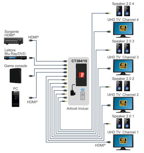 La matrice HDMI® CT384/10 permette la connessione di 4 sorgenti HDMI® a 4 uscite video come TV o monitor permettendo la scelta di qualunque ingresso per ogni uscita.La selezione della combinazione di collegamento tra ingressi e uscite può essere effettuata tramite tasti, tramite il telecomando fornito in dotazione, tramite controllo TCP/IP o tramite seriale RS-232.** ATTENZIONE ** : la matrice è dotata di funzione scaler permette quindi la riduzione automatica della risoluzione da 4K a 1080p.** Specifiche **- Funzione scaler da 4K a 1080p- Supporto HDR, HDR10, HDR10+, Dolby Vision, HLG- Dimensioni 220x105x44mm- Peso 720g- Consumo 10W max** Specifiche HDMI® **- Conforme HDCP 2.2- 4K@60Hz YUV 4:4:4- Spazio colore RGB, YCbCr, xvYCC- SupportoAudio PCM2.0ch, PCM5.1ch, PCM7.1ch, DolbyDigital/Plus/EX, Dolby TrueHD, DTS, DTS-EX, DTS-96/24, DTS High RES, DTS-HD Master Audio, DSD** Caratteristiche **Ingresso: 4 HDMI®Uscita: 4 HDMI®|Audio COAX|Audio L/RCompatibile 3D: siCompatibile 4K: siProfondità colore: 12bit/canaleRisoluzione massima: 4Kx2K@60HzFunzioni aggiuntive: IR, HDR, ARC, Scaler, LAN, RS232** Contenuto confezione **1x Matrice HDMI®1x Telecomando IR1x Alimentatore 12Vdc 2,5A1x Staffe di montaggio1x Cavo ricevitore IR** Down scaling: ** Solo il formato video HDMI® 4K@30/50/60Hz (spazio colore YUV 4:4:4 oppure 4:2:0) può essere scalato a 1080p@30/50/60Hz. Lo scaler non supporta il down scaling di segnali con spazio colore RGB.** Nota: ** in modalità SCALER, la matrice non permette la gestione dell’HDR.La matrice trasferisce in uscita l'HDR solo a patto che tutte le TV connesse siano 4K e che entrambe supportino l'HDR. Attenzione: spesso l'HDR deve essere abilitato nel menù di configurazione della TV.