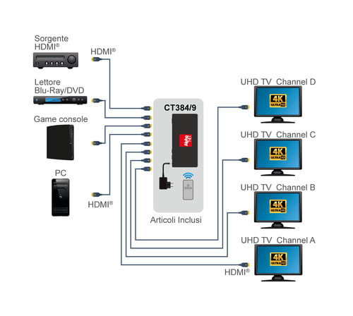 La matrice HDMI® CT384/9 permette la connessione di 4 sorgenti HDMI® a 4 uscite video come TV o monitor permettendo la scelta di qualunque ingresso per ogni uscita.La selezione della combinazione di collegamento tra ingressi e uscite può essere effettuata tramite tasti meccanici oppure tramite il telecomando fornito in dotazione.** ATTENZIONE ** : la matrice è dotata di funzione scaler permette quindi la riduzione automatica della risoluzione da 4K a 1080p.Supporta larghezza di banda video 18Gbps** Specifiche **- Funzione scaler da 4K a 1080p- Supporto HDR, HDR10, HDR10+ e Dolby Vision- Dimensioni 220x205x19mm- Peso 535g- Consumo 11,1W** Specifiche HDMI® **- Conforme HDCP 2.2- 4K@60Hz YUV 4:4:4- Spazio colore RGB, YCbCr, YUV- Supporto Audio LPCM2.1ch, LPCM5.1ch, LPCM7.1ch, Dolby TrueHD e DTS-HD Master Audio** Caratteristiche **Ingresso: 4 HDMI®Uscita: 4 HDMI®Compatibile 3D: siCompatibile 4K: siProfondità colore: 12bit/canaleRisoluzione massima: 4Kx2K@60HzFunzioni aggiuntive: Scaler, IR** Contenuto confezione **1x Matrice HDMI®1x Telecomando IR1x Alimentatore 12Vdc 2,5A** Down scaling: ** Solo il formato video HDMI® 4K@30/50/60Hz (spazio colore YUV 4:4:4 oppure 4:2:0) può essere scalato a 1080p@30/50/60Hz. Lo scaler non supporta il down scaling di segnali con spazio colore RGB.** Nota: ** in modalità SCALER, la matrice non permette la gestione dell’HDR.La matrice trasferisce in uscita l'HDR solo a patto che tutte le TV connesse siano 4K e che entrambe supportino l'HDR. Attenzione: spesso l'HDR deve essere abilitato nel menù di configurazione della TV.