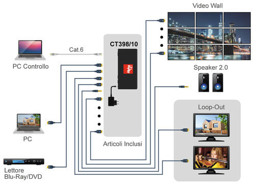 La matrice HDMI® CT398/010 permette la connessione di 2 sorgenti HDMI® a 2 uscite loop-out HDMI® e a 9 uscite video wall con scaler, permettendo la scelta di qualunque ingresso per ogni uscita.La selezione della combinazione di collegamento tra ingressie uscite può essere effettuata tramite controllo TCP/IP o tramite seriale RS-232.** Specifiche **- Funzione scaler da 4K a 1080p- Supporto multi-risoluzione fino a 4K@60Hz- Supporto HDMI loop out 2 canali- Supporto PIP su video wal- Supporto rotazione immagine 180°- Supporto controllo RS-232 e TCP/IP- Trasmissione dei comandi CEC con visualizzazione a PC- Compensazione cornice in 2 modalità- EDID manuale** Specifiche HDMI® **- Conforme HDCP 2.2- 4K@60Hz YUV 4:4:4- Spazio colore RGB, YCbCr, xvYCC- Supporto Audio PCM2.0ch, PCM5.1ch, LPCM, Dolby, AC3, DTS** Caratteristiche **Ingresso: 2 HDMI®Uscita: 9 HDMI®|Audio COAX|Audio L/R|Audio analogicoCompatibile 4K: siRisoluzione massima: 4Kx2K@60HzFunzioni aggiuntive: RS232, Audio analogico, COAX, LAN, Loop-Out** Contenuto confezione **1x Matrice Video Wall HDMI®1x Connettore Phoenix 5-pin2x Connettore Phoenix 3-pin1x Cavo da Phoenix a RS2321x Cavo CAT.61x Cavo da USB a RS232** Nota: ** Il formato 4K@25/30Hz può essere usato soloper display standalone, non per video wall.