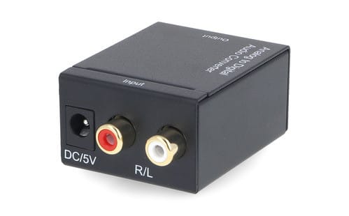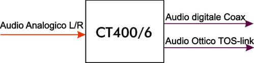 Il convertitore CT400/6 permette di convertire un segnale audio analogico in un segnale audio digitale.** Specifiche **- Converter audio analogico in Coax e TOSLINK.- Velocità di campionamento: 48kHz.- Installazione plug-n-play** Caratteristiche **Tipologia: ConvertitoreIngresso: 1 Audio L/RUscita: 1 Audio COAX|TosLink®Compatibile 3D: noCompatibile 4K: noInstallazione: Plug-and-playInterfaccia di controllo: Nessuna** Caratteristiche Elettriche **Tipo Alimentazione: AlimentatoreIndicatore/i led di stato: Si** Contenuto confezione **1x Convertitore1x Alimentatore 5Vdc 1A - 5,5x2,1 Positivo centrale