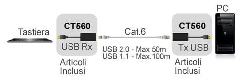 L'extender CT560 consente la trasmissione del segnale tramite un cavo Cat.5e/Cat.6 (non incluso) fino ad una distanza massima di 50m per i dispositivi USB 2.0.** Caratteristiche elettriche **USB standard: USB 1.1, USB 2.0Distanza massima: 50m (USB 2.0), 100m (USB 1.1)Cavo consigliato: UTP Cat5e o superioreAlimentazione: Non richiesta** Caratteristiche meccaniche **Corpo: plasticoProtezione: IP20Colore: NeroTemperatura di lavoro: -10º ~ 40ºCAttenzione:Non utilizzare in ambienti esterni.**Caratteristiche **Tipologia: Trasmettitore+RicevitoreTipo Extender: USBDistanza Extender: 50m