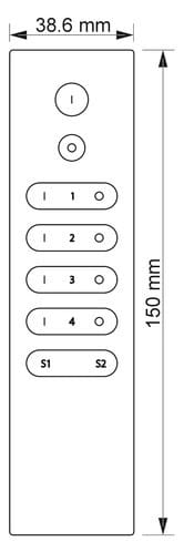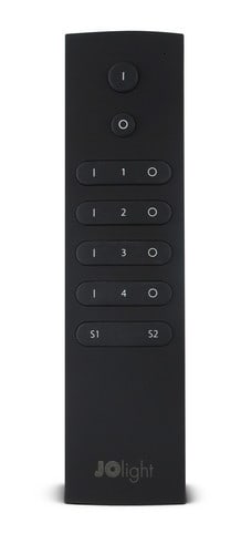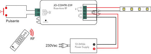 Telecomando per controllo dell’intensità della luce di strisce led bianche.Il telecomando JO-CONTR-026, utilizzato con gli appositi ricevitori di Alpha Elettronica consente di regolare contemporaneamente l’intensità luminosa di strisce led collegate alle uscite del ricevitore, che possono essere suddivisi in quattro zone. L’intensità può essere modificata premendo a lungo il pulsante della zona interessata sulla posizione "1"per aumentare l'intensità e "0"per diminuire l'intensità. Premendo velocemente si accende/Spegne la striscia.** Caratteristiche **- Il telecomando è in grado di gestire fino a quattro zone (tasti 1,2,3,4).- Ogni zona deve essere composta da almeno un ricevitore (non incluso)- Ad ogni ricevitore possono essere collegate strisce led monocolore su ognuna delle 4 uscite- Per ogni zona possono essere salvate fino a tre intensità.Caratteristiche Tecniche TelecomandoFrequenza: 868MHzBatterie: 3V 1 x CR2025Raggio d'azione: 20mFunzioni: DimmerZone: 4 (salvataggio di 2 impostazioni per ogni zona)** Caratteristiche Generali **Funzione: TelecomandoAdatto per: MonocoloreMetodo di controllo: RF** Caratteristiche Meccaniche **Lunghezza: 150mmLarghezza: 38.6mmAltezza: 12mmGrado di protezione: IP20Materiale corpo: PlasticaColore corpo: Nero** Note **Il telecomando deve essere utilizzato in abbinamento con almeno un ricevitore apposito di Alpha Elettronica (non incluso).Un telecomando JO-CONTR-026 può lavorare con tanti ricevitori (fino a 100 a patto che tutti i dispositivi coinvolti siano all’interno del raggio di 200m).Un ricevitore può lavorare con più telecomandi (fino a 6).Al momento dell'installazione i telecomandi devono essere associati ai relativi ricevitori tramite il tasto “Learning key” presente sul ricevitore.