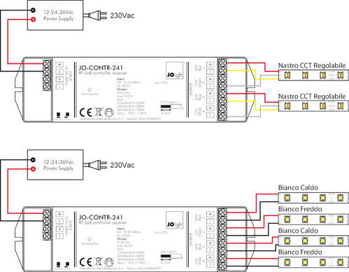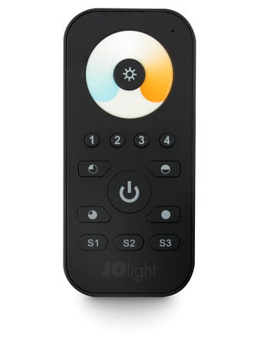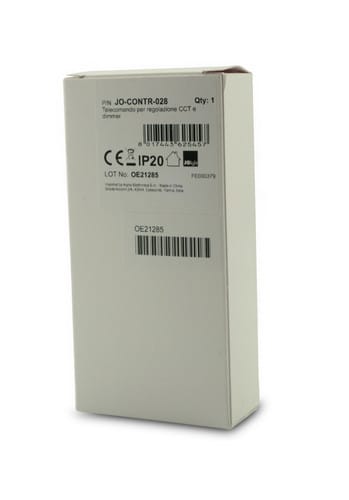 Telecomando per il controllo della temperatura colore di strisce led bianche.Il telecomando JO-CONTR-028, utilizzato con gli appositi ricevitori di Alpha Elettronica opportunamente connessi a strisce led bianche CCT oppure a coppie di strisce led biancocaldo (WW) e bianco freddo (PW), consente di regolare la temperatura di colore CCT (Correlated Color Temperature) miscelando le due colorazioni. Questa funzione é detta "Tunable White".La gradazione CCT del colore può essere modificata tramite rotella touch. Inoltre è possibile regolare l’intensità luminosa (dimmer) tramite i tasti funzione.** Caratteristiche **- Il telecomando è in grado di gestire fino a quattro zone (tasti 1,2,3,4).- Ogni zona deve essere composta da almeno un ricevitore ** (nonincluso) **- Ad ogni ricevitore possono essere collegati fino a 2 nastri a CCT regolabile oppure 2 coppie di strisce led bianco caldo (WW) e bianco freddo (PW)- Per ogni zona possono essere salvati fino a tre gradazioni di colore.** Caratteristiche Tecniche Telecomando **Frequenza: 868MHzBatterie: 3 x AAA (1,5V)Raggio d'azione: 30mFunzioni: Regolazione bianco CCT, DimmerZone: 4 (salvataggio di 3 impostazioni per ogni zona)** Caratteristiche Generali **Funzione: TelecomandoAdatto per: CCT RegolabileMetodo di controllo: RF** Caratteristiche Meccaniche **Lunghezza: 120mmLarghezza: 55mmAltezza: 17mmGrado di protezione: IP20Materiale corpo: PlasticaColore corpo: Nero** Note **Il telecomando deve essere utilizzato in abbinamento con almeno un ricevitore apposito di Alpha Elettronica ** (non incluso) ** .Un telecomando JO-CONTR-028 può lavorare con tanti ricevitori (fino a 100 a patto che tutti i dispositivi coinvolti siano all’interno del raggio di 30m).Un ricevitore può lavorare con più telecomandi (fino a 6).Al momento dell'installazione i telecomandi devono essere associati ai relativi ricevitori tramite il tasto “Learning key” presente sul ricevitore.