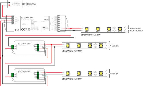 Ripetitore passivo di alimentazione adatto per estendere l'installazione di più sorgenti luminose a led monocromatiche.L'amplificatore consente di estendere l'utilizzo del controller monocromatico dimmer principale detto "Master"consentendo quindi di mantenere la sincronizzazione dell'intensità di luce comandata dal controller principale.** Caratteristiche Generali **Funzione: AmplificatoreAdatto per: Monocolore** Caratteristiche Elettriche **Tipo regolazione: Tensione costante (CV)Tensione d'ingresso: 12/24/36VTensione d'uscita: come ingressoTipo di uscita: morsettiCorrente/Ch: 8An. canali: 1Potenza nominale (12V): 96WPotenza nominale (24V): 192W** Caratteristiche Meccaniche **Lunghezza: 95mmLarghezza: 37mmAltezza: 20mmGrado di protezione: IP20Materiale corpo: PlasticaColore corpo: Bianco** Caratteristiche Termiche **Temp. di funzionamento: -10 / 40°C** Note **L'alimentatore dovrà essere scelto in funzione del tipo di carico led utilizzato per tensione e corrente.Utilizzare un alimentatore con potenza nominale maggiore rispetto al carico led da alimentare (circa 30%).