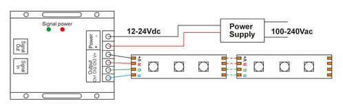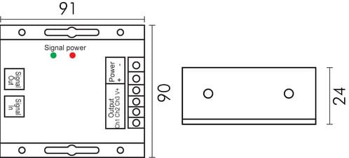 ** Caratteristiche **Centralina di controllo per sorgenti luminose a led RGB.L'apposito telecomando RF consente il controllo del colore della luce risultante, l'intensità luminosa e il controllo on/off.Inoltre il dispositivo mantiene memoria dell'ultimo modo di funzionamento impostato anche dopo aver spento e riacceso l'alimentazione.Più controller possono lavorare tra di loro simultaneamente se connessi tramite un cavo RJ45.** Caratteristiche Generali **Funzione: ControllerAdatto per: RGBMetododi controllo: RF** Caratteristiche Elettriche **Tipo regolazione: Tensione costante (CV)Tensione d'ingresso: 12/24VTensione d'uscita: come ingressoTipo di uscita: morsettiMetodo di connessione: anodo comuneCorrente/Ch: 10An. canali: 3Potenza nominale (12V): 360WPotenza nominale (24V): 720W** Caratteristiche Meccaniche **Lunghezza: 91mmLarghezza: 90mmAltezza: 24mmGrado di protezione: IP20Materiale corpo: Alluminio verniciatoColore corpo: Nero** Caratteristiche Termiche **Temp. di funzionamento: -10 / 40°C** Note **- I controller della serie Sync Tecnology sono ricevitori universali se non programmati.Questo significa che tutti i ricevitori sono controllabili da qualsiasi telecomando della stessa serie.Per sincronizzarli in modo ottimale possiamo sfruttare la tecnologia SyncTecnology collegando i ricevitori tramite un cavo Cat.5e o Cat.6 utilizzano le porte RJ45 presenti sul dispositivo.Il controller che decidiamo essere il principale dovrà essere collegato alla porta SignalOUT mentre i controller che decidiamo essere slave andranno connessi alla porta SignaIN.Una volta collegati in questo modo i controller slave si comportano da amplificatori e saranno perfettamente sincronizzati.E' possibile abbinare il controller-ricevitore a un telecomando tramite una procedura specifica e ti invitiamo a seguire il video dedicato per vedere come fare.- L'alimentatore dovrà essere scelto in funzione del tipo di carico led utilizzato per tensione e corrente.- Utilizzare un alimentatore con potenza nominale maggiore rispetto al carico led da alimentare (circa 30%).