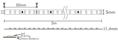 ** Caratteristiche Generali ** Applicazione: Per illuminazione Tempo di vita L70B50: 20000h Numero cicli di accensione: 10000 cicli Fattore di sopravvivenza: 0.9 Tipo nastro: Monocolore Colore Supporto: Bianco Tipo di led: smd 2835 0.2W n. Led al metro: 120 led/m Lunghezza max in cascata: 5m Rischio fotobiologico: Esente ** Caratteristiche di Illuminazione ** Colore: Bianco caldo Flusso Nastro Led: 800lm/m Flusso @ 50cm: 400lm CRI: 90 Warm-up (60%): 0.1s Fattore mantenimento flusso: 0.96 Uniformità colore (SDCM): 6 ** Caratteristiche Elettriche ** Classe energetica: G Potenza Nastro Led: 9.6W/m Potenza 50cm: 4.8W Potenza unità minima: 0.48W Tens. funzionamento DC: 24Vdc Dimmerabile: si Alimentatore: Esterno (non incluso) ** Caratteristiche Sorgente Luminosa ** Temp. Colore: 2700K ** Caratteristiche Meccaniche ** Lunghezza nastro: 5m N. Led/taglio: 6 Lunghezza taglio minima: 50mm Larghezza: 5mm Spessore: 1.4mm Altezza: 2mm Fissaggio: Biadesivo 3M Grado di protezione: IP20 Tipo di protezione: Nessuno Connessioni: Cavo libero ** Caratteristiche Termiche ** Temp. di funzionamento: -10 / 40°C